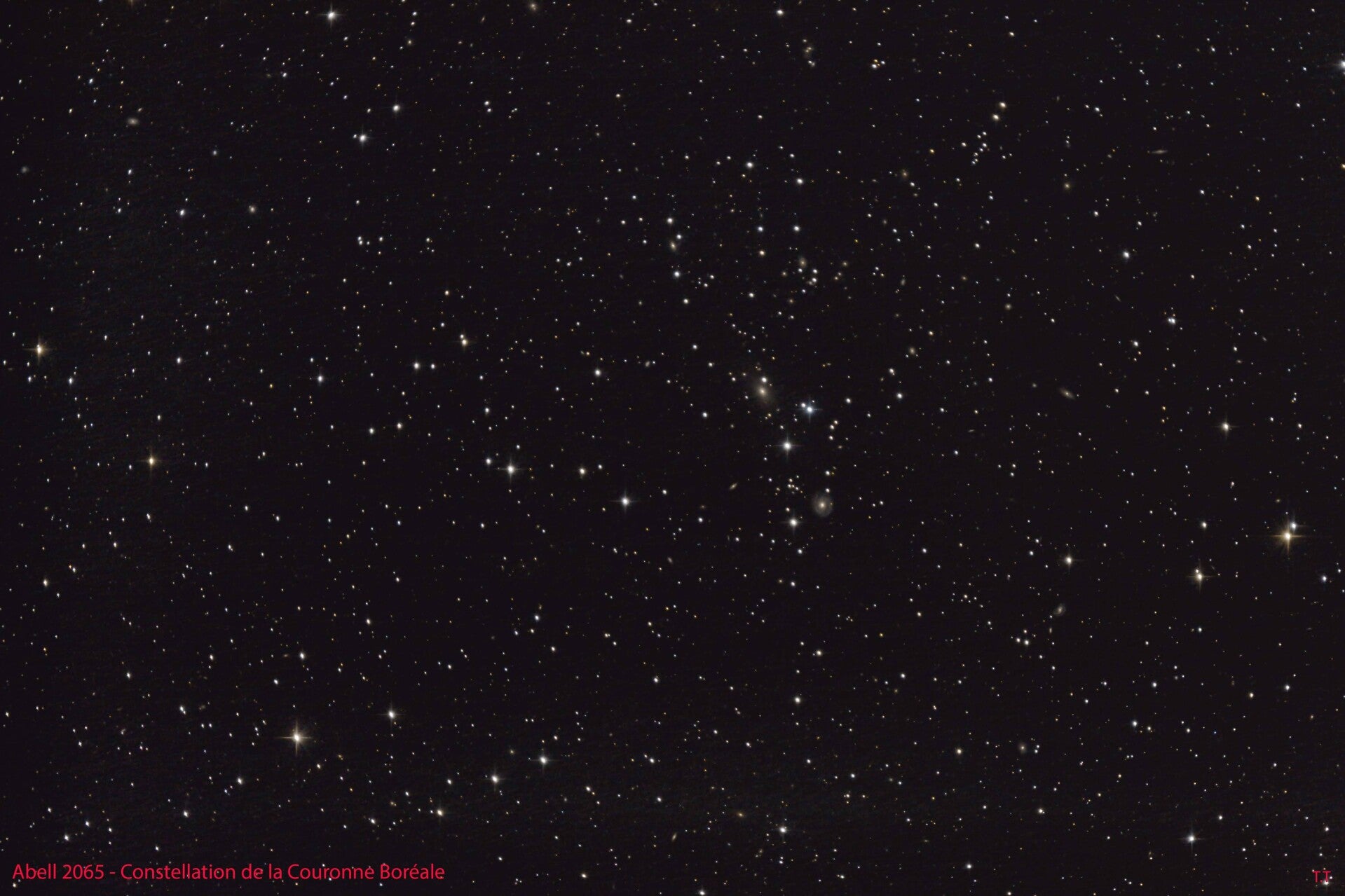 Remarque : Abell 2065 est un amas de galaxies très concentré dans la constellation de la Couronne boréale contenant plus de 400 galaxies membres, dont les plus brillantes sont de magnitude 16. L'amas est à plus d'un milliard d'années-lumière de la Terre. (Wikipédia).