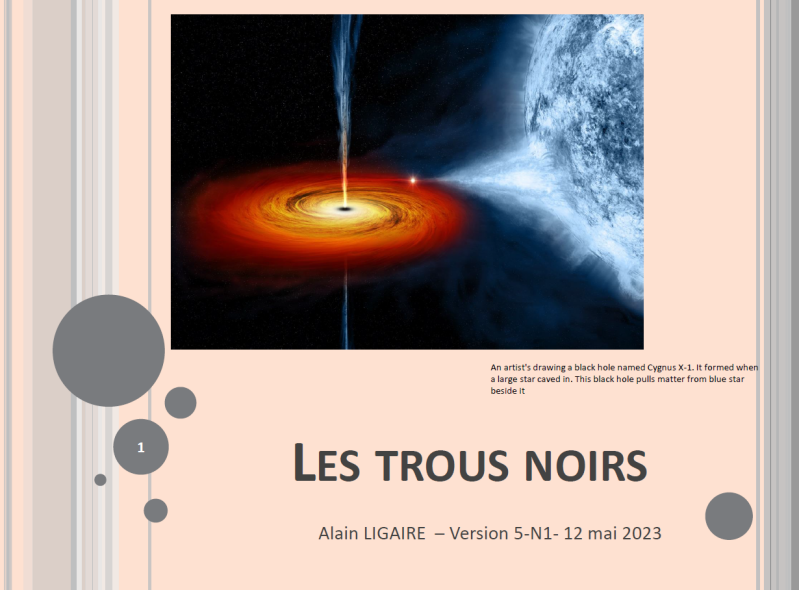 Ce diaporama a été présenté au club vendredi 12 mai 2023 par Alain LIGAIRE. Le Thème : les Trous Noirs » . Après un bref historique, l’exposé comprend deux parties : 1) quelques aspects de la physique des trous noirs en lien avec la relativité générale 2) les découvertes récentes sur les trous noirs grâce à des instruments d’observation de plus en plus perfectionnés.