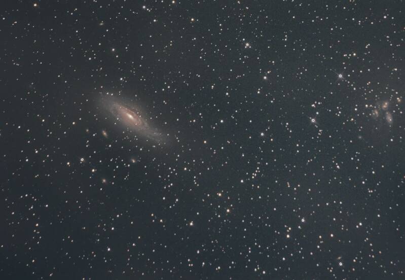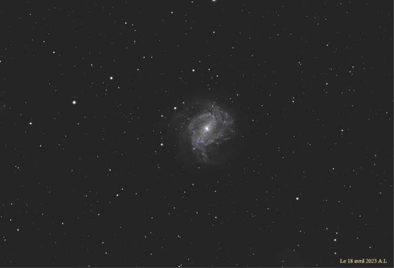Remarque : M33, sans doute satellite de la galaxie d'Andromède. C'est la troisième galaxie la plus massive du Groupe local, après la galaxie d'Andromède et la Voie lactée mais devant le Grand Nuage de Magellan. Cette galaxie peut être visible à l’œil nu dans des conditions extrêmement bonnes. Difficile à photographier sa magnitude surfacique étant très élevée