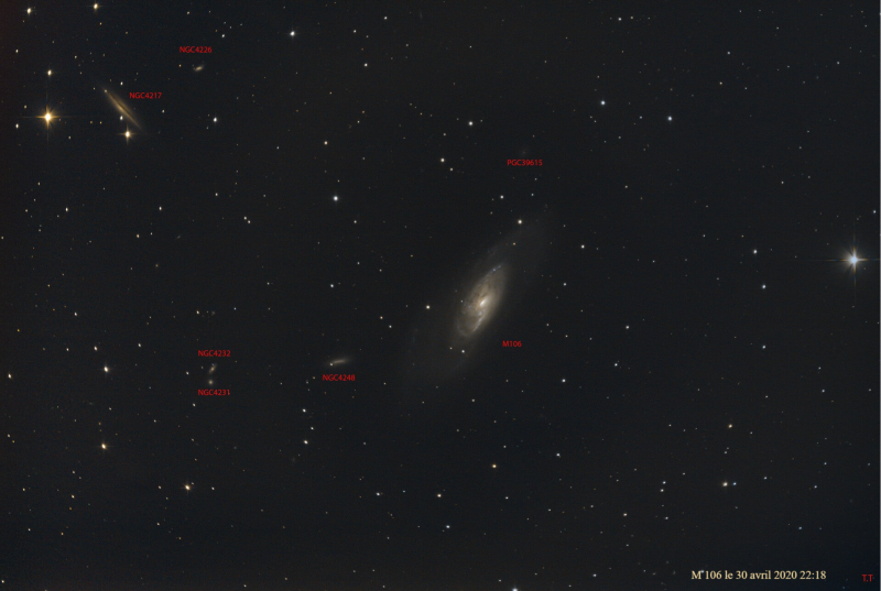 Remarque : M 106 est doté d'un mégamaser à base de vapeur d'eau. Un maser est l'équivalent d'un laser fonctionnant dans le domaine des micro-ondes au lieu de la lumière visible. Il existe plusieurs formes de maser astronomique dans l'univers dont certains sont associés à des régions de formation d'étoiles. Les émissions de M106 à une fréquence de 22 GHz proviennent de molécules d'eau de type ortho, une évidence d'un gaz moléculaire dense et chaud. Le mégamaser de M106 a permis d'obtenir la mesure la plus précise à ce jour de sa distance, soit une valeur de (7,2 ± 0,3) Mpc ((23,5 ± 1,0) Mal). (Wikipédia)