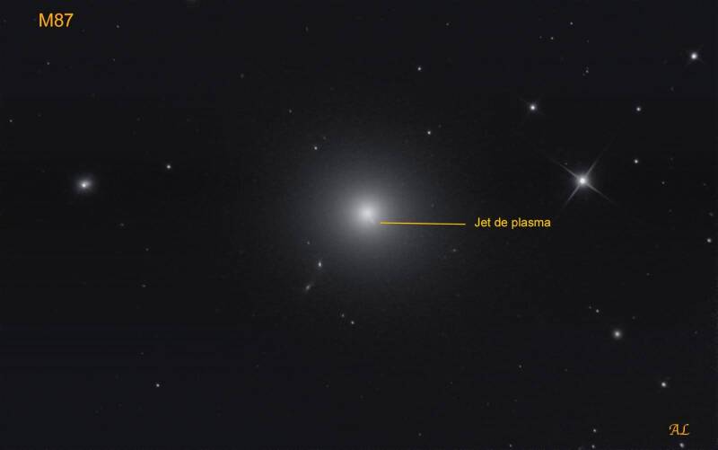 Remarque : En 1947, une importante source radio fut localisée à l'endroit même de Messier 87, elle fut nommée « Virgo-A ». Cette source fut confirmée comme étant Messier 87 en 1953, et le jet sortant du cœur de cette nébuleuse extra-galactique comme en étant la cause. Ce jet part du cœur avec un angle de position de 260°, d'une distance angulaire de 20" avec une épaisseur angulaire de 2". L'astronome germano-américain Walter Baade découvrit que la lumière de ce jet était polarisée, ce qui suggérait que l'énergie était générée par l'accélération d'électrons se déplaçant à une vitesse relativiste dans un champ magnétique. L'énergie totale dissipée par ces électrons fut estimée à 5 × 1056 eV. En 1969-70, une composante très énergétique de l’émission radio fut trouvée très précisément dans l'alignement de la source optique du jet. M 87