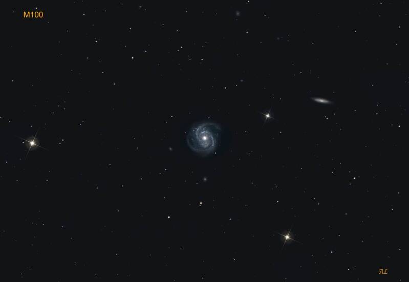Remarque : M 100 (NGC 4321), Galaxie spirale intermédiaire, fait partie du groupe de M87. M87 et M100 font partie l'amas de la Vierge et ils comptent parmi les membres importants de cet amas. Ses bras très nettement définis sont peuplés de jeunes étoiles bleues, nées des interactions de la galaxie avec ses voisines.