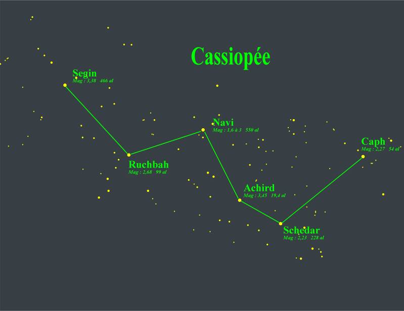 Remarque : IC 63, nébuleuse diffuse très pâle et indistincte, elle est surnommée "Le fantôme". C'est un objet difficile à voir car noyé sous un flot d'étoiles. Seuls les gros instruments lumineux permettent de voir cette nébuleuse qui s'accompagne d'IC 59, encore moins distincte. Cette nébuleuse est en fonction de l’étoile Navi, une étoile variable, multiple et irrégulière sa magnitude varie de + 1,6 à + 3.