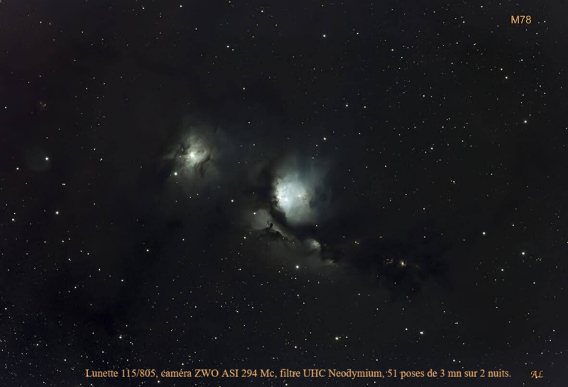 Remarque : Photo prise avec une lunette APO Quadruplet TS-Optics 71 mm F/4.9 Caméra couleur ZWO ASI 585 Mc avec filtre de contraste Néodymium Baader/ 109 poses de 120 secondes. Photo d'Alain L. primée par la revue "L'ASTRONOMIE" n° 187 page 72